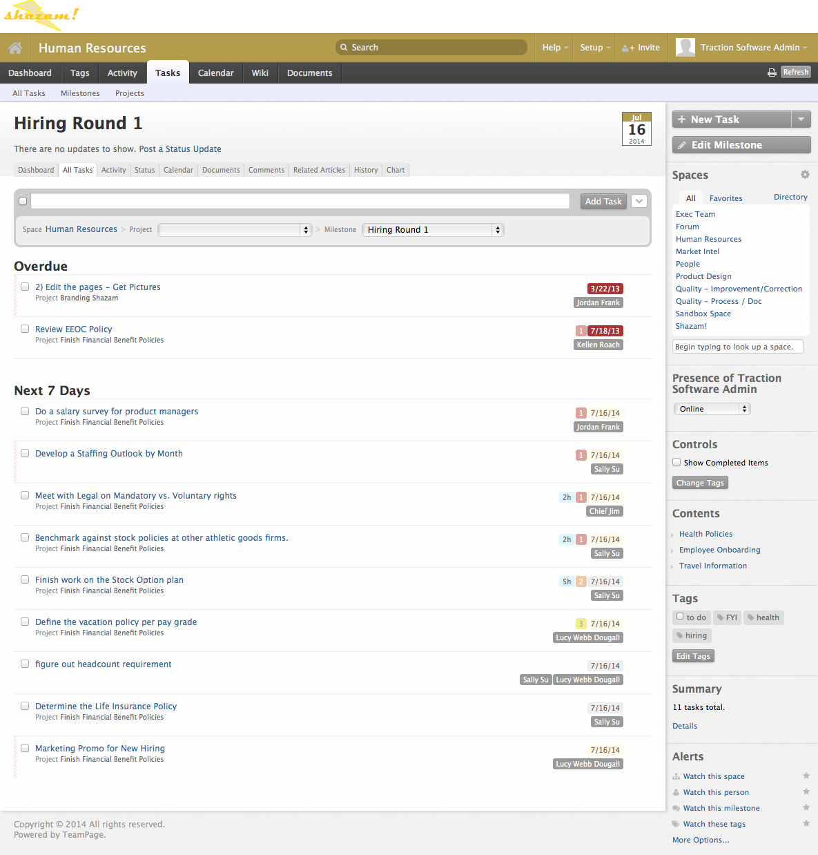 Who needs to do this? By when? How long should it take? Tasks go beyond line-item to-do/done status, letting you add assignees, due dates, and people to notify. Like everything in Teampage, they can be connected to any paragraph. Or they can stand on their own.