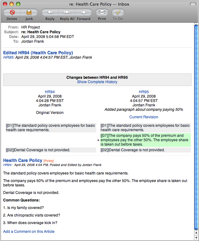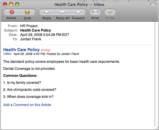 The following examples show notification of a new Article (a "Health Care Policy") followed by a notification that its been edited and a notification about a comment on it.
