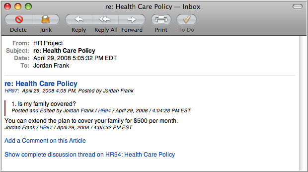As one component of Traction's exceptional support for threaded discussions, the comment example below shows the new comment and, for context, also includes quoted text to show you the text of the paragraph it comments on.