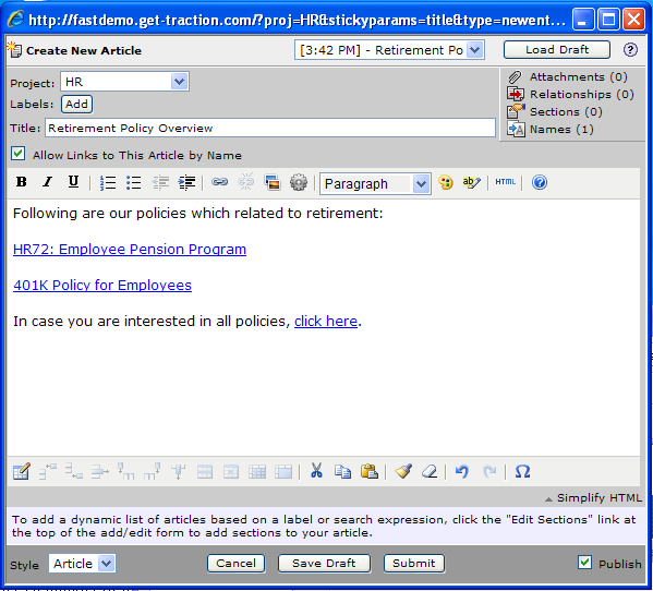 The Employee Pension Program Link is made by linking to an existing Article, Comment or Attachment. In this case, the user starts by typing Pension and gets a set of pages that include the word in their titles. The resulting link can optionally include the Traction ID (in this case HR72). If the user knew ahead of time that the link target was Traction ID HR72, then they could have simply written HR72 into the article text.