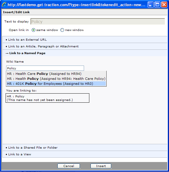 The 401K Policy for Employees link is made by linking to a Named Page. In this case, the user started typing the characters "Policy". A list of Named Pages with the word Policy in their Page Name appears and the user selects the 401K Policy for Employees name.