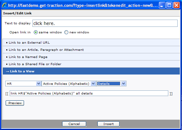 The final "click here" link that links to all policies is made by choosing Link to a View. From here, you can choose to link to:
