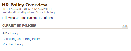 You'll notice that an ADD button is included in the section. People with permission to publish in this space can easily add to the section simply by filling in the New Article form that pops up. This makes it easy to encourage a specified type of contribution. With a simple section setting, you can configure the ADD button to launch a Article Templates or even custom forms.