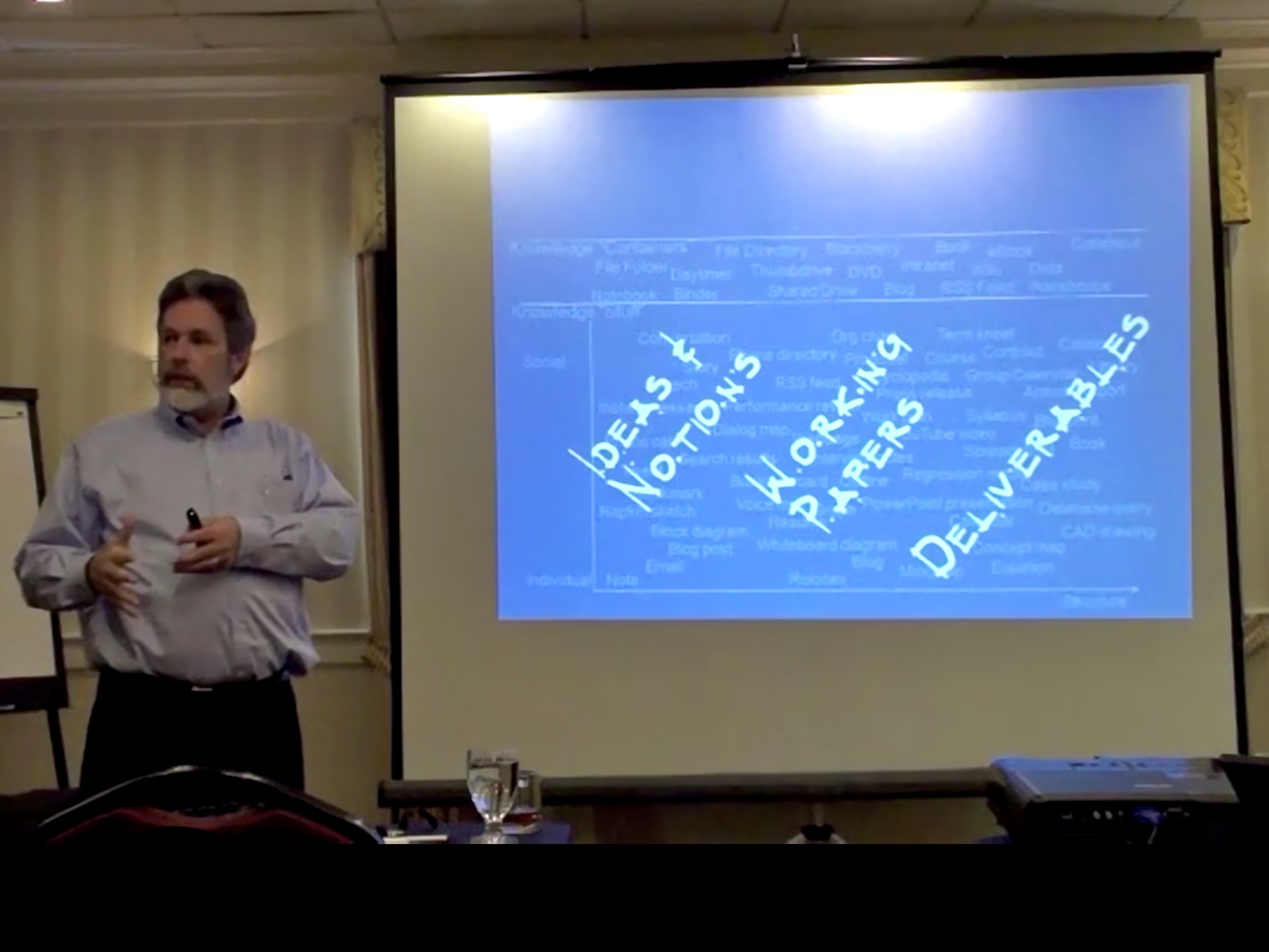 Jim used a two dimensional diagram to show artifacts of work, with individual to socially constructed artifacts shown vertically, and informal to formally structured artifacts shown on the horizontal axis. In broad categories he talked about 'Ideas and Notions' on the left, 'Working Papers' in the center, and 'Deliverables' on the right.