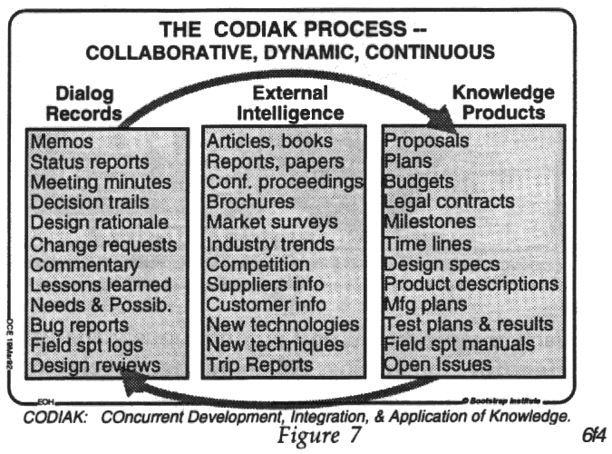 Figure 7 itemizes the evolving knowledge base within three categories: (1) Dialog Records: memos, status reports, meeting minutes, decision trails, design rationale, change requests, commentary, lessons learned, (2) External Intelligence: articles, books, reports, papers, conference proceedings, brochures, market surveys, industry trends, competition, supplier information, customer information, emerging technologies, new techniques (3) Knowledge Products: proposals, plans, budgets, legal contracts, milestones, time lines, design specs, product descriptions, test plans and results, open issues."