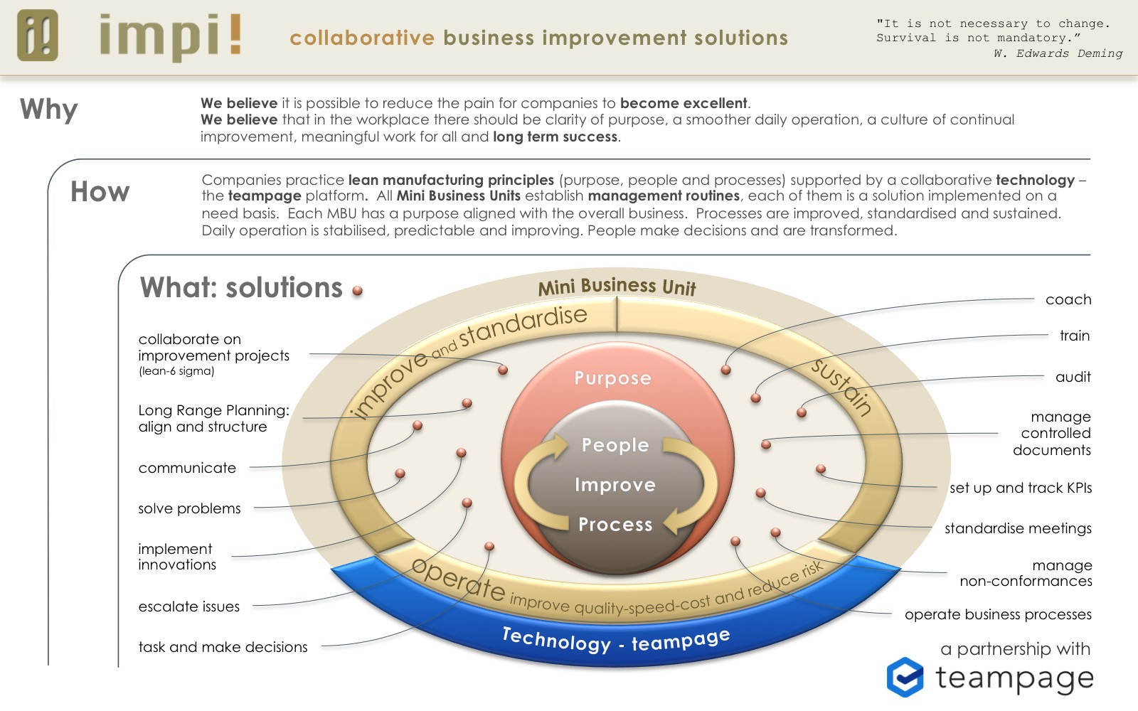 All impi! solutions are built on TeamPage on a wiki space and are standard documents. Every solution starts with a Policy (the why) and a Standard Operating Procedure (the how). The SOP is the hub that links all the other documents (the spokes). The templates used for these documents are the same that the client can use for their own controlled documentation in their own wiki space called “Knowledge Central”. Two outputs of every improvement projects are a) an operational improvement and b) documentation in Knowledge Central. The project templates used to run improvement projects comprise standard articles that will naturally become elements of the BOP (e.g. SIPOC, business process maps). When the project leader reaches the Control or Adjust part of the project, large chunks of the documentation would have been written. Using the capability of TeamPage simplifies the linking and tagging of documents. The organization steadily builds its very own Wikipedia, and it’s ISO 9001 compliant. The risk of deadwood documentation is reduced: team members create their own documentation, hyperlinking contextualizes the documentation and tagging and search capability ease retrieval of information.