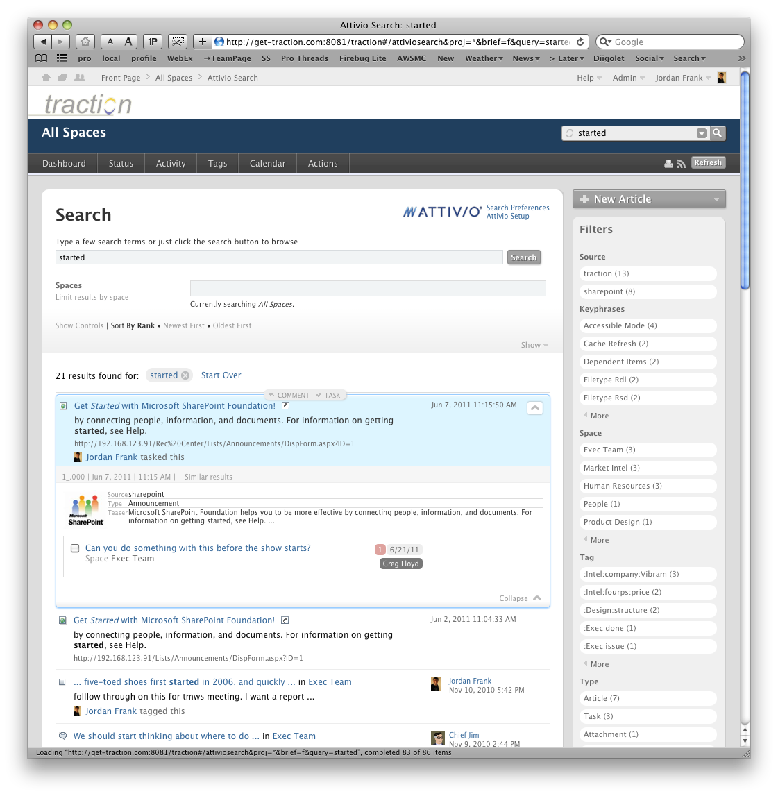 Using TeamPage Attivio Search Plus and TeamPage's Social Enterprise Web, external documents, pages, and transactions are now able to become social objects seamlessly integrated with Traction TeamPage's action tracking, search, collaboration and communication. Enterprise 2.