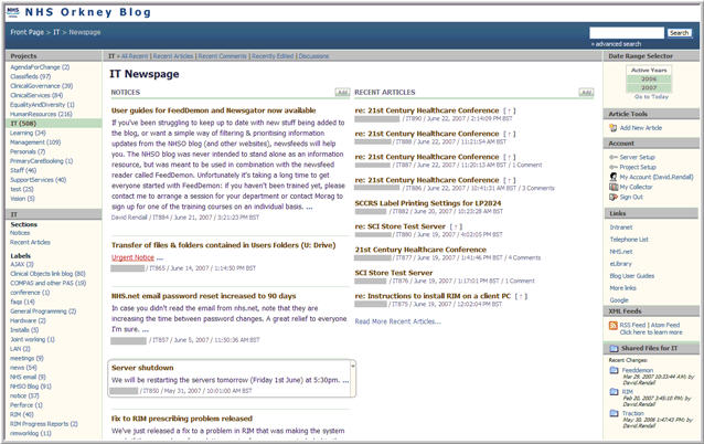 David Rendall of NHS Orkney (a regional health board of the UK's National Health Service) deployed Traction TeamPage and NewsGator Enterprise Server for a variety of use cases spanning the entire NHS Orkney staff. A year later, the use of the platform continues to gather momentum. NHS Orkney now has a single, central point of reference for internal communication and information as well as external news. Rendall says: