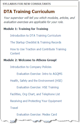 The DTA Training space implements this approach and has greatly improved the scalability of Athens Group’s training program. A newly hired DTA Consultant works through the Training Curriculum which guides him or her through the entire multi-week process.