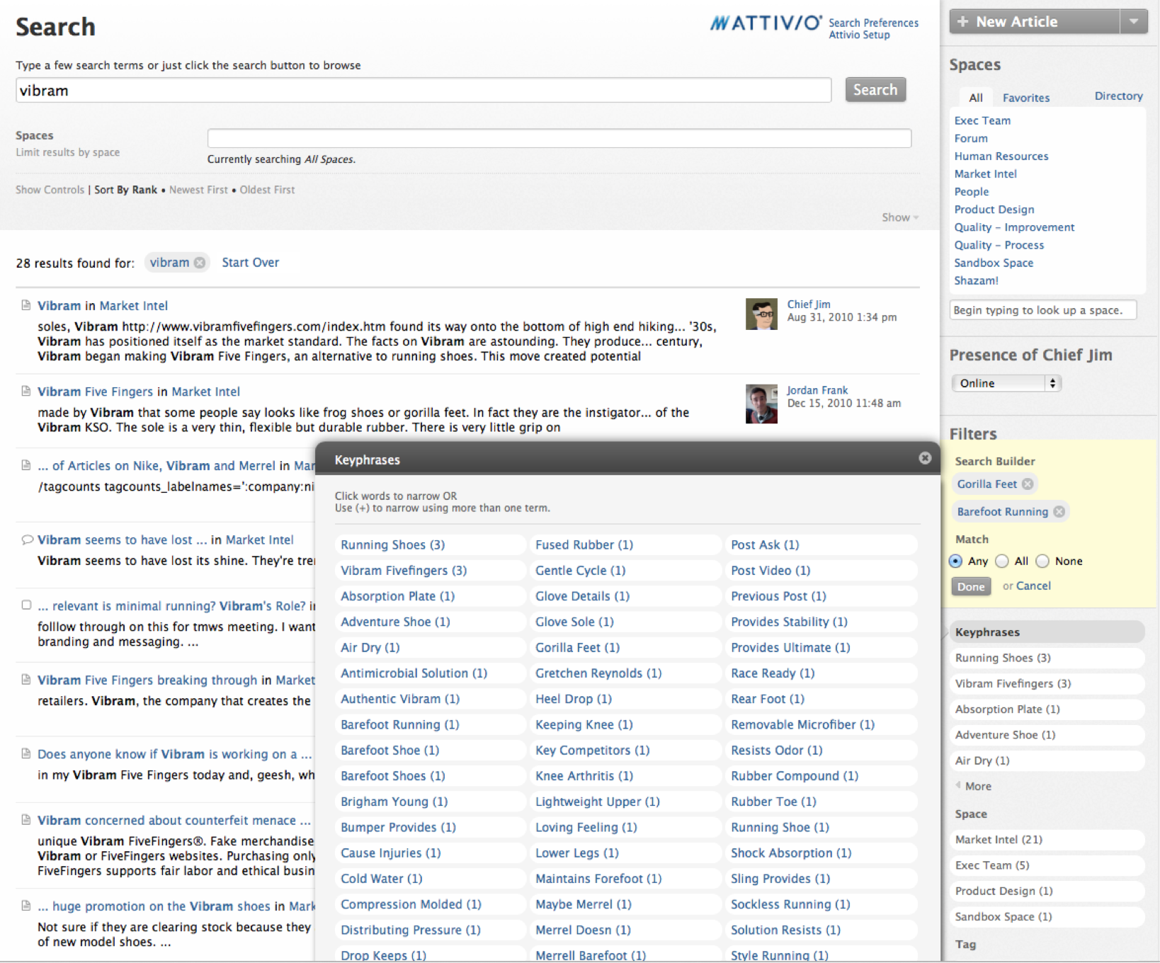 The TeamPage Attivio® Search Module adds value to your intelligence by enabling easy analysis and retrieval of the content. In the image here, you can see a quick search for "Vibram" is augmented by a drill down interface into extracted key phrases, and many other facets like Tags, Spaces, People, Companies and more.